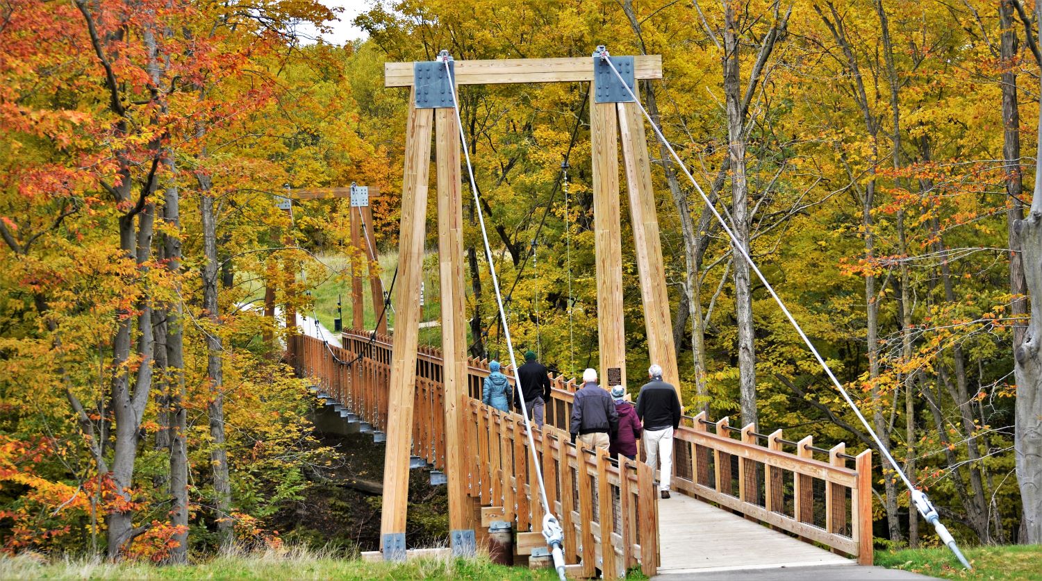 Grand Ravines: Both the north and south properties boast excellent, 10′ wide paved pathways. On the south side, begin at the parking lot and head northeast to the fully accessible 275′ long suspension bridge. The fully enclosed dog park also offers paved trails and easy-to-open and close gates. On the north side of the park, the paved Idema Explorers Trail follows the Grand River, all the way to Grand River Park. You can frequently spot bald eagles soaring in the sky from this trail.